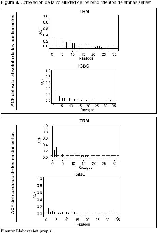La Figura 8 demuestra la presencia de correlación entre diferentes períodos de la volatilidad de los rendimientos. Es decir, la volatilidad de un período determinado está relacionada con los valores pasados de ésta; y dicha relación tiende a desaparecer a medida que se consideran mayores rezagos. En otras palabras, existe volatilidad agrupada (volatility clustering).