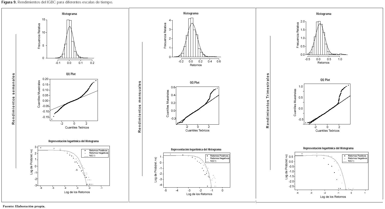 Como se puede observar en la Figura 5, las características de la distribución de los rendimientos tienden a ser cada vez más similares a la distribución normal, a medida que la escala de tiempo se agranda; en especial las colas tienden a ser menos pesadas y la leptocurtosis menos pronunciada o desaparece. No obstante, el comportamiento de los rendimientos aún no es lo que se esperaría de una distribución normal (Ver Anexo 2 para observar las pruebas de normalidad de Jarque-Bera, así como las demás estadísticas descriptivas. En ese mismo anexo se presenta la Figura 9 para la serie de rendimientos del IGBC.)