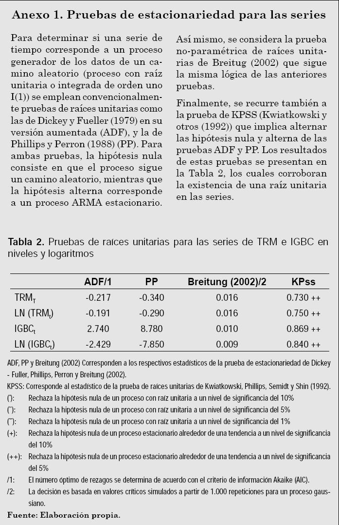 En el caso de las dos series de estudio, intuitivamente esta característica puede ser observada en la Figura 1. Sin embargo, para estar seguros de esta propiedad de las series se pueden efectuar pruebas estadísticas de estacionariedad (o conocidas como pruebas de raíces unitarias en la literatura econométrica de series de tiempo) que soporten dicha observación. Los resultados de cuatro pruebas diferentes de raíces unitarias aplicadas a cada una de las series se presentan en el Anexo 1, estos resultados brindan evidencia para determinar que las dos series son I(1), es decir, cumplen el primer hecho estilizado.