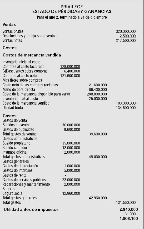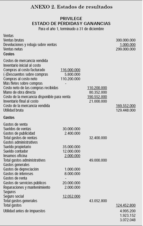 –"Miren, lo que don Luis me dice a mí ya me venía preocupando hace varios días, porque con la apertura del nuevo almacén los costos fijos se han aumentado en un 10%, llevando a la rentabilidad del negocio en los últimos meses casi a cero; es más, este almacén en el que nos encontramos es casi la única fuente de ingresos de esta empresa y si no fuera por la sabia decisión de don Luis de confeccionar para algunos competidores las prendas especializadas que estos no pueden hacer, no estaríamos contando el cuento. Yo les traje algunas cifras que les voy a entregar para que las analicen". Procedió entonces a entregarles a todos un paquete de hojas grapadas (ver Anexos 1 y 2 "Balance General y Estado de Resultados", Años 1 y 2).