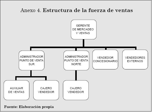 –"Yo estoy convencido que tenemos un excelente producto y al igual que mi mamá, pienso que lo que debemos hacer es vender más; con la cuña radial que estamos pasando hace tres meses nos vamos a dar a conocer en un mayor porcentaje y con todo ese "ruido" vamos a aumentar el tráfico en nuestras tiendas, yo creo que el mercadeo (Ver Anexo 4 "Estructura de Fuerza de Ventas) tiene mucho que hacer y para mí, la publicidad es la clave, pero para eso tenemos que invertir. Yo estoy trabajando en unas ideas para hacer unos comerciales de televisión, vestir gente de la farándula, que son íconos y generadores de opinión; hacer desfiles y publicar avisos en las principales revistas del país. Es más, no nos vendría mal remodelar las tiendas".