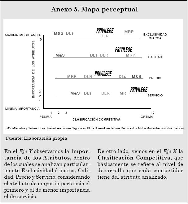 Privilege era la marca con la que la familia Jaramillo se había lanzado al mercado caleño, ofreciendo ropa sobre medida y talla para hombres y mujeres con altos estándares de calidad, servicio personalizado y diseños de moda; su portafolio de productos incluía ropa formal y casual para ejecutivos(as) que iban desde los 25 hasta los 65 años y que por el precio de las prendas debían tener ingresos promedio mayores a cinco salarios mínimos vigentes (Ver Anexo 3 "Análisis del Mercado"). Pese a no tener competidores directos, algunas marcas exclusivas de ropa talla importada, estaban dentro del grupo de consideración de los consumidores objetivo de esta marca, al igual que algunos diseñadores locales y marcas nacionales reconocidas (Ver Anexo 5 "Mapa Perceptual"). Estos competidores se convertían en sustitutos de la marca y dado que en su mayoría tenían marcas más reconocidas que Privilege afectaban seriamente el nivel de ventas de esta compañía. Adicionalmente, la entrada de nuevos competidores con presencia en la capital del país ofrecía una amenaza digna de consideración.