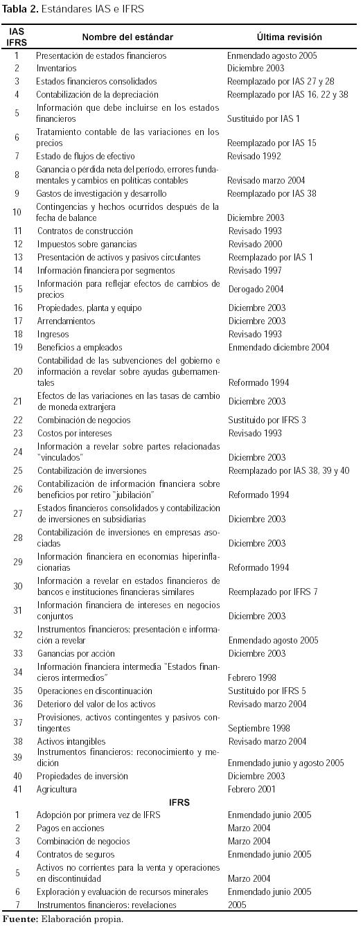 El IASB, a septiembre de 2006, tiene vigentes treinta IAS y siete IFRS. En la Tabla 2 se presentan los estándares emitidos desde la creación del organismo.