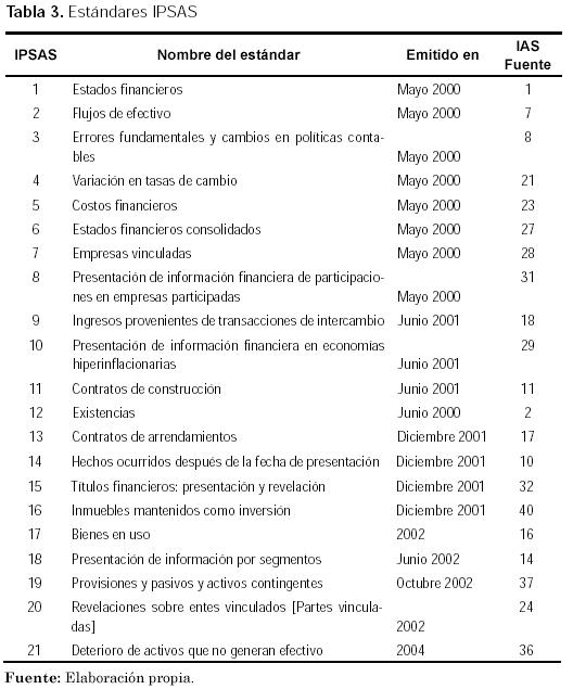 El marco conceptual del IASB aplica también para estados financieros confeccionados conforme a los IPSAS que emite el IPSASB.2 Hasta agosto de 2006 ha emitido 21 estándares, todos con los IAS-IFRS como fuente. La Tabla 3 presenta los estándares vigentes.