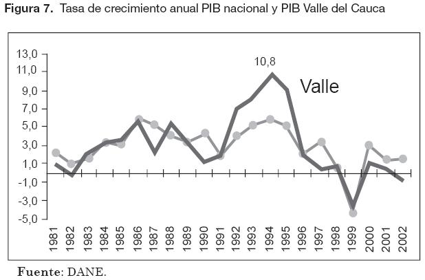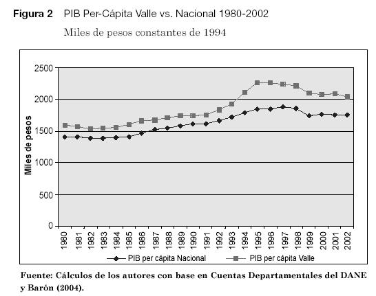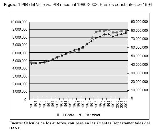 En la Figura 1 se ha superpuesto la evolución del PIB del Valle del Cauca – medido en el eje izquierdo– con la evolución del PIB nacional – medido en el eje derecho– . El período considerado es 1980–2002. Todos los valores están expresados en millones de pesos constantes de 1994. Esta Figura muestra que el PIB del Valle evolucionó conjuntamente con el PIB nacional hasta principios de los años 90. De 1992 a 1996, se presenta un salto regional del PIB y, a partir de entonces hasta 2002, con una caída en 1999 y 2000, el PIB regional se estanca en un poco menos de nueve mil millones de pesos de 2004. La "meseta" a la cual llega la línea del Valle en los siete años entre 1996 y 2002, denota ese estancamiento.