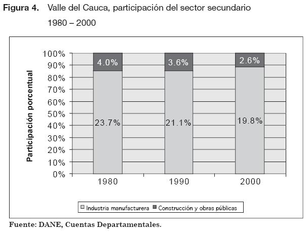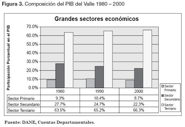 La Figura 3 muestra que, según el DANE, de 1980 a 2000 el sector primario mantiene una participación entre el 9% y el 10% en la generación del PIB del Valle; el sector secundario (industria manufacturera y construcción) disminuye su participación; y aumenta la del sector terciario. Así, hoy en día la economía vallecaucana es una economía de servicios: dos terceras partes de su PIB son generadas por estas actividades.