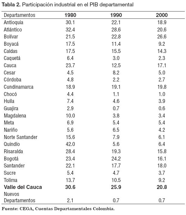 Cabe mencionar que los datos de las cuentas departamentales del CEGA (Centro de Estudios Ganaderos y Agrícolas) no coinciden con los del DANE, pero las tendencias son idénticas. La desindustrialización del Valle del Cauca también se manifiesta en las cuentas departamentales del DANE (Departamento Administrativo Nacional de Estadística): según éstas, la industria manufacturera del Valle del Cauca generaba en 1980 el 23.7% del PIB regional; esa participación cae al 20.91% en 1990; y a 18.8% en 2000; en 2002 el índice de industrialización experimenta una ligera recuperación y se sitúa en 19.7%. Las cuentas departamentales del Departamento Administrativo de Planeación del Valle del Cauca (DAPV) también permiten deducir que se ha presentado una desindustrialización regional; esta entidad estimaba que en 1990 el sector industrial manufacturero aportaba el 40% del PIB departamental.