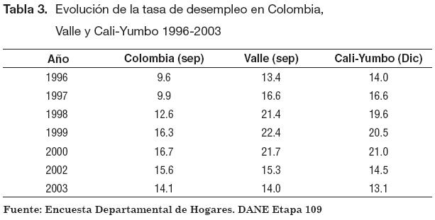 La Tabla 3 muestra que la tasa de desempleo aumentó sostenidamente de 1996 a 2000 en Colombia, el Valle y el Área Metropolitana de Cali–Yumbo. Después empieza a disminuir. Se observa que la tasa de desempleo en el Departamento del Valle ha sido superior a la nacional, hasta que convergen en 2003. A nivel regional se observa que desde 1998 la tasa de desempleo del Valle es mayor que la tasa de desempleo de Cali–Yumbo. Se deduce que desde ese año el resto del Valle sufre más el flagelo del desempleo que el área metropolitana.