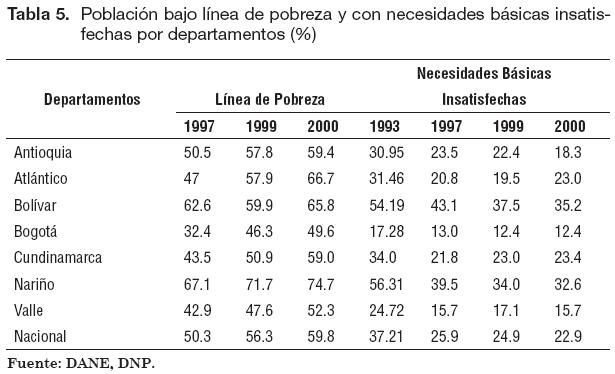 En cuanto a los indicadores de la población bajo línea de pobreza (LP) y con necesidades básicas insatisfechas (NBI), estos han presentado un comportamiento inverso. El indicador de LP ha venido incrementándose, tanto en el Valle como a nivel nacional, mientras que el indicador de NBI ha mostrado una reducción durante toda la década de los noventa. Este comportamiento se explica por el gasto público en infraestructura básica que es uno de los factores de medición de este indicador. El aumento del indicador de LP en el departamento del Valle se asocia con la crisis que se dio después de 1995, en especial con el creciente desempleo y la creciente informalidad laboral. Así mismo se puede observar que Bogotá y Valle son las regiones con menores índices de NBI; de hecho sus cifras son inferiores a las del total nacional, igualmente sucede con la LP de estas dos regiones.