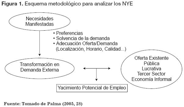 "La clave del concepto NYE está en la visualización de meras necesidades sociales o en la exteriorización de que esas necesidades desde la esfera de la familia a la esfera social, y en la posibilidad de que esas necesidades, transformadas en demanda y tras un proceso de estructuración de la oferta, se constituyan en verdaderas fuentes de generación de empleo" (Palma 2003,p. 30), (Ver Figura 1).