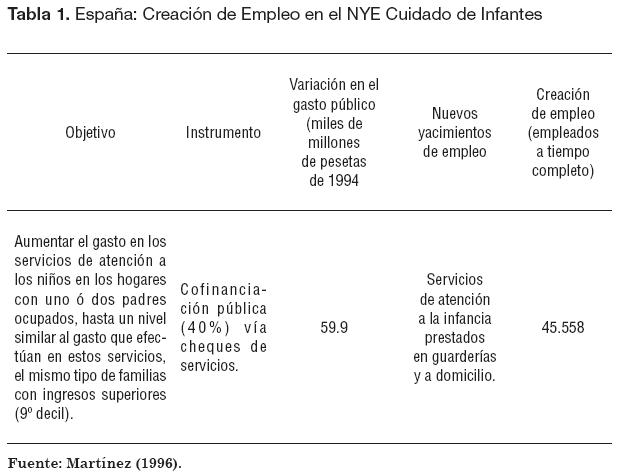 En España se realizó un ejercicio para determinar el impacto sobre el empleo que tendría "una estrategia de aumentar el gasto en los servicios de atención a los niños en los hogares con uno o dos cónyuges ocupados, y con niños entre 0 y 5 años, hasta un nivel similar (70%) al gasto que efectúan en estos servicios el mismo tipo de familias con ingresos superiores (decil 9)" (Martínez 1996, p. 2). Los resultados se muestran en la Tabla 1.