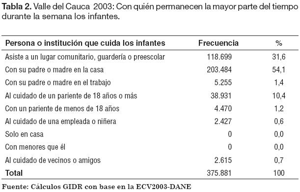 Con respecto al primer y tercer aspectos mencionados en los párrafos anteriores se advierte que con estímulos adecuados a la demanda y la reestructuración de la oferta es posible incrementar la demanda externa de servicios de cuidado, atención y educación a los menores de cinco años en el Valle del Cauca. La Tabla 2 evidencia que los hogares comunitarios, guarderías o preescolares de origen estatal no satisfacen la demanda total de cuidado de infantes por parte de los hogares.