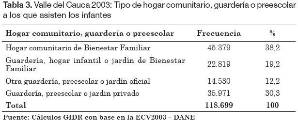 Del total de infantes que asiste a un lugar comunitario, guardería o preescolar, el 70% lo hace a un establecimiento de origen estatal, sea operado o financiado por el Instituto Colombiano de Bienestar Familiar (ICBF) o de carácter oficial vinculado a los gobiernos locales (Tabla 3).