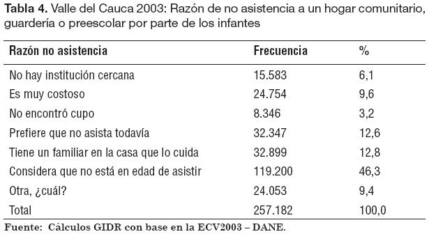 El segundo aspecto se relaciona con las preferencias de los hogares. Teniendo presente sólo a los infantes que no asisten a una institución que se encargue de su cuidado, se encuentra que el 12.6% de éstos no lo hace por preferencia propia de los padres y el 46.3% de los infantes no asiste porque en opinión de sus padres no está en edad para ello (Tabla 3). Este aspecto es conveniente resaltarlo, puesto que existe la posibilidad de que algunos hogares no externen su demanda en el mercado, incluso con adecuados estímulos (subsidios) financieros.