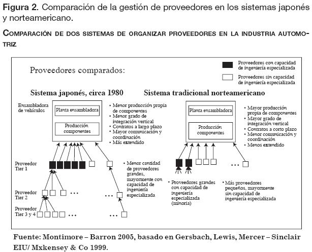 El modelo americano ha estado basado en la adquisición de competidores débiles. General Motors, vendió Delphi y Ford vendió Vissteon para crear las dos empresas más grandes del mundo en autopartes y aplicaron una política de ajuste de costos en sus proveedores. Es muy conocida e incluso objeto de estudio, la forma ruda con que López, el vicepresidente de compras mundiales de General Motors, trataba a sus proveedores. Este ejecutivo rompió todas las reglas que había con los proveedores: Abrió todos los contratos a subastas, dejó de favorecer a los proveedores de GM, y exigió mejoría del 50% en productividad. Su énfasis en el corto plazo empeoró la relación destruyendo los beneficios en el largo plazo (Moffett – Youngadahald, 1998).