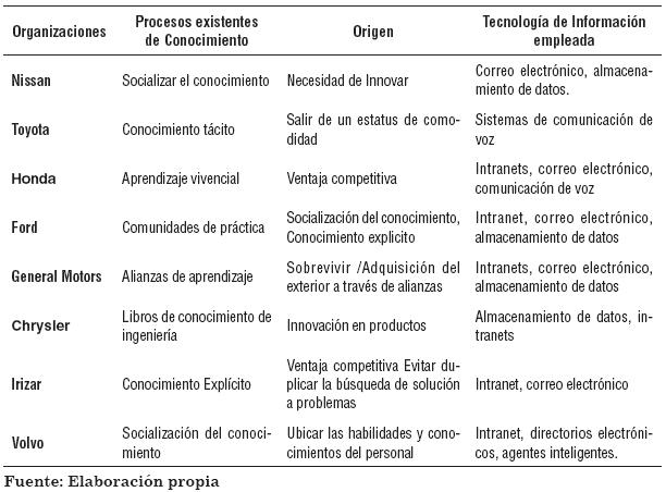 La industria automotriz internacional ha desarrollado diferentes prácticas de gestión del conocimiento que pueden ser resumidas en el cuadro siguiente: