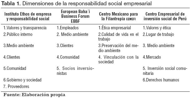 Después de la revisión de diferentes estudios sobre la RSE, puede afirmarse que es un tema que no se limita a las acciones sociales desarrolladas por la empresa en la comunidad, sino que implica también prácticas e interacciones con diversos públicos, entre los que se encuentran colaboradores, consumidores, clientes, proveedores, medio ambiente, gobierno y sociedad. A partir de las definiciones abordadas se agruparon las variables y dimensiones que integran la RSE según cuatro autores institucionales (Tabla 1), tomando para el presente estudio el criterio del CEMEFI, ya que en estas cuatro variables pueden incluirse los componentes de los otros modelos.