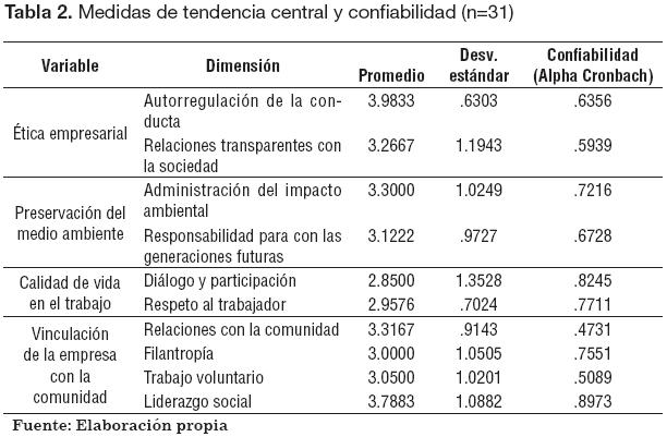 En la Tabla 2 se reportan las medidas de tendencia central (promedios y la desviación estándar), así como la confiabilidad final del cuestionario.