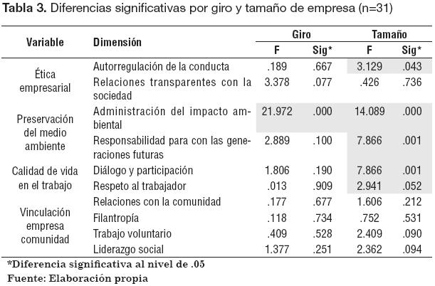 H2: Existen diferencias significativas según el tamaño (grande, mediana, pequeña y micro) y giro (industrial y de servicios) de la empresa en los niveles de ética empresarial, la preservación del medio ambiente, la calidad de vida en el trabajo y la vinculación de la empresa con la sociedad como componentes de la RSE en las empresas afiliadas al CEVAT.