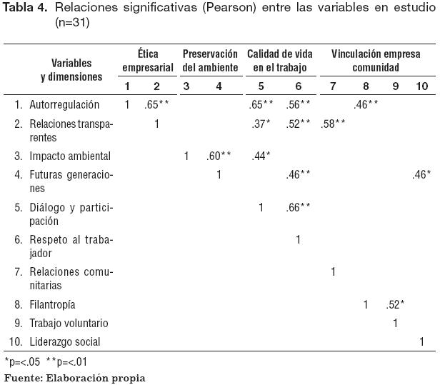 La Tabla 3 refleja las diferencias significativas de medias según el giro y tamaño de empresa. En la Tabla 4 aparecen las correlaciones (Pearson) entre las variables estudiadas. Como puede verse, las hipótesis planteadas se confirman parcialmente.