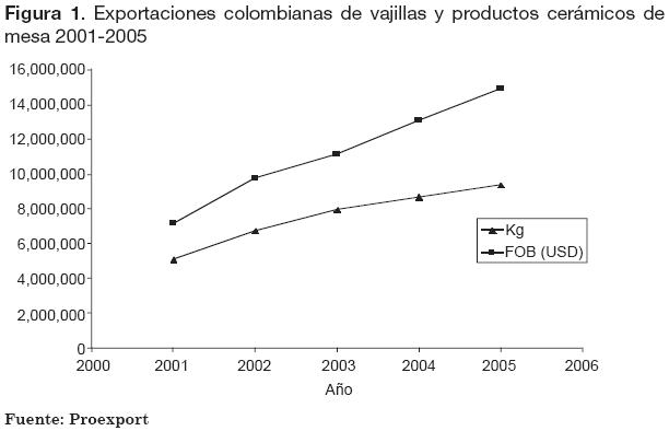 La investigación mostró que el valor de las exportaciones totales de productos cerámicos colombianos muestra una tendencia creciente en los últimos cinco años, donde se nota un crecimiento del 108% (en valor) entre 2001 y 2005 (Figura 1).