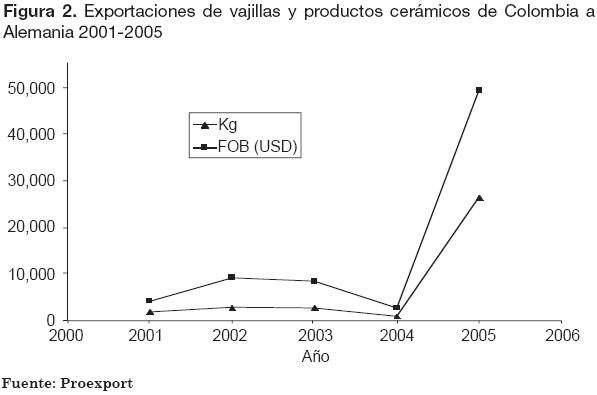 Con respecto a la demanda alemana por cerámica colombiana se nota un crecimiento extraordinario del 1.070% (en valor) entre 2001 y 2005 (Figura 2).