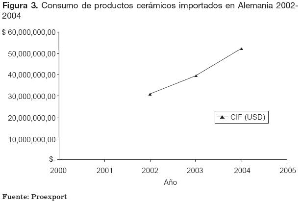 Se nota un crecimiento en las importaciones del producto en Alemania que aumentó su consumo de vajillas importadas en un 69% entre el 2002 y el 2004, con un crecimiento promedio del 30% anual (Figura 3).