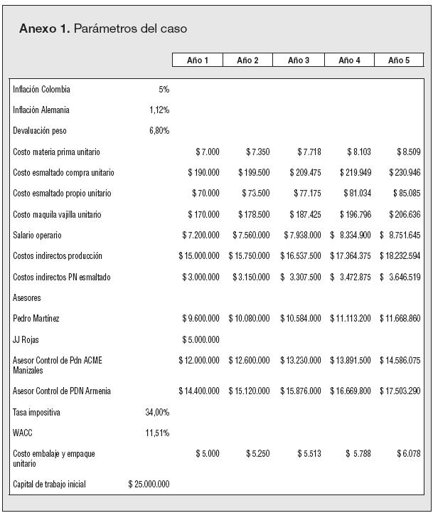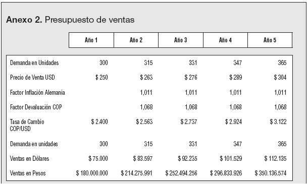 También determinaron que el precio de venta inicial de introducción en Alemania será de USD $250 EXW, que será incrementado anualmente en un 5%. Adicionalmente esperan que, al inicio del 2008 el dólar tenga un valor cercano a los COP $2.400 y que la devaluación nominal promedio del peso frente al dólar para los siguientes cuatro años sea del 6,8%2 anual. Finalmente esperan que la inflación en Alemania se mantenga cercana a su promedio de los últimos años, ubicándose en el 1,12%, y que la inflación en Colombia se mantenga en el 5% para los primeros cinco años del proyecto, que fue el periodo que escogieronpara evaluar la inversión.3