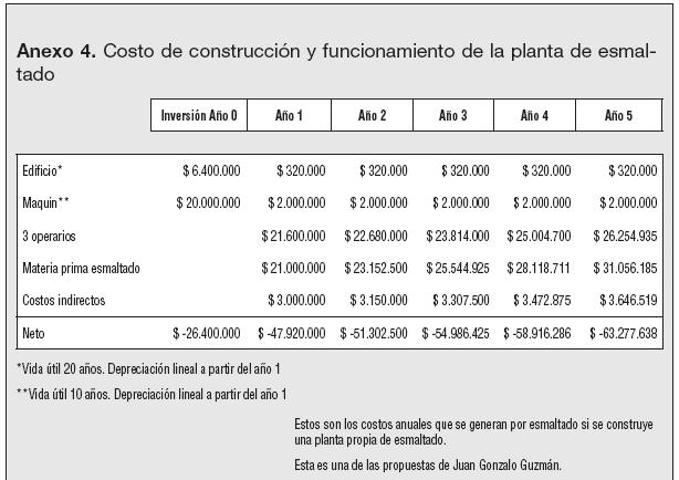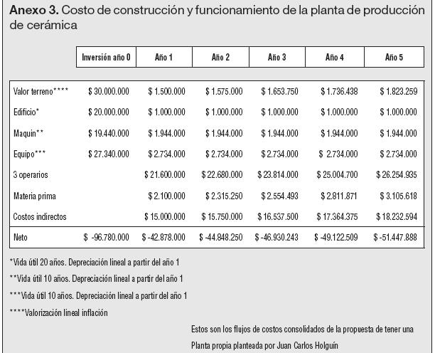 JG: Yo tengo claro que esta propuesta es la más costosa y la que más tiempo va a tomar para generar ganancias. Creo que la idea de la planta en Armenia es buena pero solo si allí se realiza el esmaltado también y estimo que esto solo agregaría $20 millones en equipos adicionales a la inversión planteada por Juan Carlos y $6,4 millones más en la adecuación del edificio, con la ventaja de que ya no se necesitaría comprar un vehículo debido a que la SIA recogería la producción en la puerta de nuestro taller, además estoy convencido de que es la mejor forma de hacer que el negocio crezca y perdure, sin olvidar que en un futuro ofrecerá la posibilidad de prestar servicios a otros artesanos de la región en operaciones de fabricación y esmaltado de productos cerámicos.