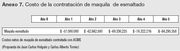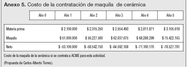 CA: Propongo que la empresa continúe con los negocios de comercialización que ha establecido con Costa Rica e Inglaterra y que todas las partes del proceso de las vajillas se realicen por outsourcing mediante contratos de maquila. Ustedes no lo han mencionado pero todos sabemos que el sostenimiento anual de un taller de producción de vajillas cuesta alrededor de quince millones anuales entre servicios públicos, seguros y mantenimiento para el primer año; además si se integra el esmaltado, estos costos aumentan un 20%.