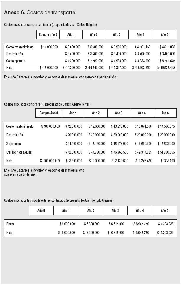 CA: En este caso, sí podríamos utilizar el dinero que tenemos ahorrado, ya que el camión nos puede generar utilidades netas de $3,55 millones mensuales por concepto de prestación de servicios de transporte en el primer año y al largo plazo creo que terminaría pagándose solo.11 Para arrancar se necesitan aproximadamente $25 millones en capital de trabajo.