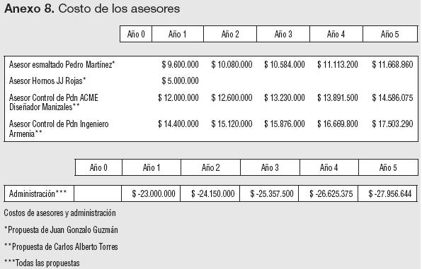 JG: Eso yo también lo tengo resuelto, ya hablé con J.J. Rojas, un antiguo compañero de colegio e ingeniero de materiales de la Universidad del Valle, el cual participará como asesor en los procesos relacionados con el montaje y puesta a punto de los hornos para cocido y esmaltado de las vajillas. J.J. me dice que nos cobraría en total $5 millones por todo el trabajo y que se los podemos pagar en el primer semestre de funcionamiento del proyecto.