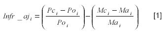 Donde Infr_aji es el rendimiento inicial ajustado de la acción i; Poi el precio de oferta de la acción i; Pci el precio de cierre de la acción i; Mai el índice de mercado al cierre del día anterior en que la acción i fuese admitida a cotización y Mci el índice de mercado al cierre del día en que la acción i fuese admitida a cotización. Los índices que se emplearán en el análisis serán en S&P 500, el NASDAQ Composite y el AMEX Composite según el mercado en que fuese admitida a cotización cada compañía.