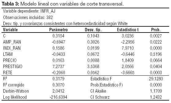 Tal y como queda de manifiesto en la Tabla 3, el modelo de corte transversal presenta un R2 corregido de 0,31 y un estadístico F de 29,13. Al no poder rechazar la hipótesis de presencia heterocedasticidad, se usaron covarianzas y desviaciones consistentes con su presencia Todas las variables explicativas resultan significativas al 10% salvo el tamaño, que no parece aportar demasiado. Si consideramos niveles del 5%, también resultaría cuestionable la relevancia del precio factor capaz de explicar el rendimiento inicial. Tanto la amplitud del rango de precios considerado en las primeras etapas de la oferta, como la proporción de capital colocado tienen una relación negativa con la variable dependiente. De forma contraria, mayores rectificaciones del precio con respecto al rango inicial y el respaldo de bancos de inversión más prestigiosos llevarían a menores subidas de cotizaciones.