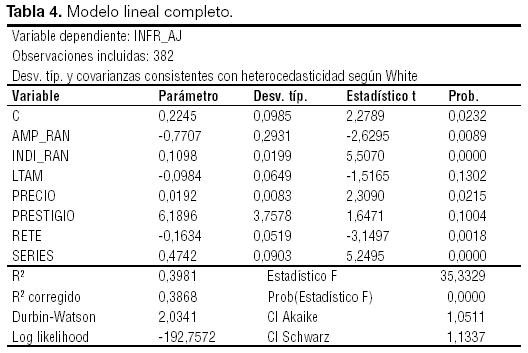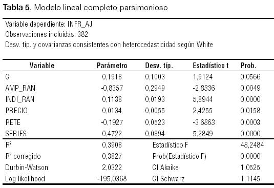 Por último, se ha intentado identificar un modelo más parsimonioso a través de la eliminación sucesiva de aquellas variables que no resultaban significativas al 5%. Tal y como queda de manifiesto en la Tabla 5, este criterio deja fuera a las variables LTAM y PRESTIGIO sin sacrificio de capacidad explicativa.