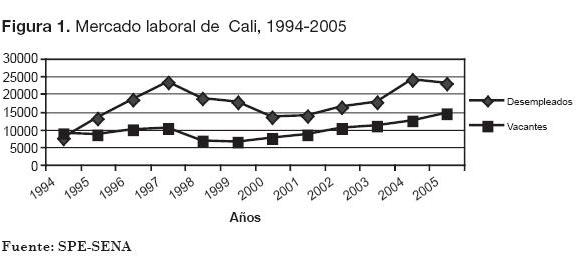 Los dos agregados muestran entre 1995 y 2000 un fuerte desequilibro, sobre todo en 1998 y 1999, los años de la recesión económica fuerte tanto en Cali como en Colombia. Sin embargo, a partir del 2000 la brecha total se va cerrando y tanto las vacantes como los desempleados registrados van en aumento. Esto es explicable, por el lado de la oferta al incremento en el volumen de la población económicamente activa y por el lado de la demanda al mayor ritmo de crecimiento económico experimentado a partir del 2000.