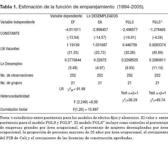 De esta forma, aquí se discute la función de emparejamiento para Cali, durante el periodo 1994-2005 a partir de la codificación de la clasificación nacional de ocupaciones, usando datos de panel a partir de la información de Vacantes, Desempleados y Emparejados (Colocados) provista por el Servicio Público de Empleo del SENA.