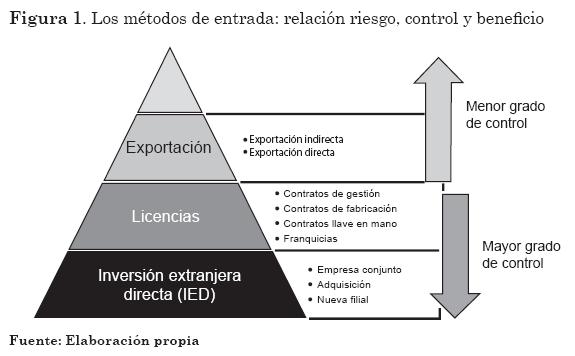 El control es la habilidad para influenciar los sistemas, métodos y decisiones (Anderson y Gatignon, 1986). A la vez, asumir control, también, implica asumir riesgo, ya que se involucra la responsabilidad en la toma de decisiones y el mayor compromiso de recursos (Anderson y Gatignon, 1986; Agarwal y Ramaswani, 1992). Los métodos de entrada que involucran un mayor grado de control, a la vez, implican mayor riesgo y, por lo general, mayores beneficios, como es el caso de la inversión extranjera directa. Por otro lado, la exportación, es el método de entrada que menor riesgo implica y recoge menores beneficios. Por lo tanto, requiere el menor control. Entonces, se puede decir que existe una relación directa entre el control, el riesgo y el beneficio (ver Figura 1).