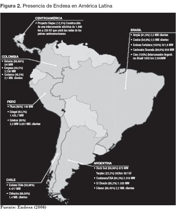 Endesa inició su expansión hacia América Latina en 1992, comenzando en Argentina, con la adquisición de un 15.3% de Edenor, la principal empresa distribuidora de la zona norte de Buenos Aires, hoy el 8 por ciento de los activos consolidados de Endesa en Latinoamérica se halla en Argentina. En 1994 se dio el ingreso de Endesa al mercado peruano, se produjo cuando se inició la privatización de las mayores empresas distribuidoras de electricidad ubicadas en Lima (Luz del Sur y Edelnor), que fueron adjudicadas a los consorcios que encabezaban las empresas chilenas Enersis y Chilquinta. En Perú se encuentra el 11 por ciento de los activos consolidados de Endesa en Latinoamérica (Endesa, 2006). En 1997, Endesa hizo efectivo el ingreso a Brasil, el mercado energético más importante de la región. La demora para ingresar a este país estuvo ligada al relativo retraso del programa privatizador del sector eléctrico en ese país y a la destacada participación de algunos grupos empresariales locales, de empresas eléctricas estadounidenses y chilenas (Cepal, 2001). Hoy el 25 por ciento de los activos consolidados de Endesa en Latinoamérica se concentra en Brasil (Endesa, 2006). En Colombia, solo hasta 1997 pudo ingresar Endesa; en este año Colombia subastó importantes paquetes de acciones de seis sociedades, de las cuales Endesa adquirió en la Empresa de Energía de Bogotá (EEB), la mayor empresa del sector y sus filiales más importantes: la Empresa Generadora de Energía de Bogotá (Emgesa) y la empresa distribuidora Codensa. Para el 2006 el 21 por ciento de los activos consolidados de Endesa en Latinoamérica se concentran en Colombia, actualmente gestiona 2.780 MW de potencia instalada a través de sus participaciones en las compañías generadoras Emgesa y Betania. En general, las empresas eléctricas privatizadas en Colombia fueron otorgadas principalmente a empresas españolas, chilenas, estadounidenses y venezolanas. Después de la apropiación por la española Endesa de Enersis, los activos comprados por la empresa chilena quedaron bajo el control de Endesa España o de la estadounidense AES Corp. por lo que estas empresas obtuvieron el control de una de las principales empresas eléctricas de Colombia (Cepal, 2001).
