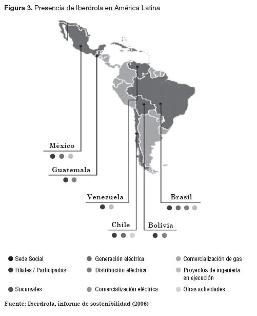 Iberdrola es la segunda mayor empresa eléctrica de España, está presente en cerca de 40 países y cuatro continentes, en América Latina posee inversiones en Brasil, México, Bolivia, Chile, Venezuela y Guatemala (Figura 3). La división de Negocio Internacional de Iberdrola se apoya en dos ejes fundamentales: las plataformas de Sudamérica México - Guatemala (Iberdrola, 2006).