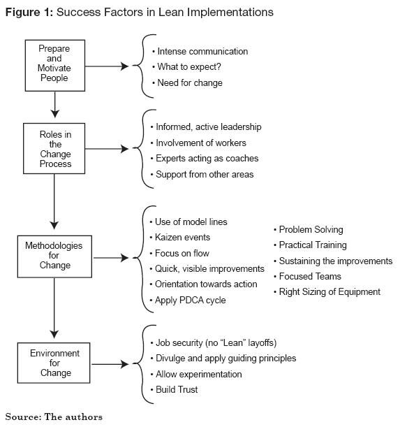Environment for change: As in any transformation effort, the environment that upper management facilitates and puts in place is critical for success. In Lean implementations is important to provide job security (no Lean-related layoffs), constant reinforcement of the guiding principles, a safe environment for experimentation and a climate of mutual trust between workers and management and also amongst different work teams. These success factors have to be taken into account in the planning of the process, so the implementation phase can begin.