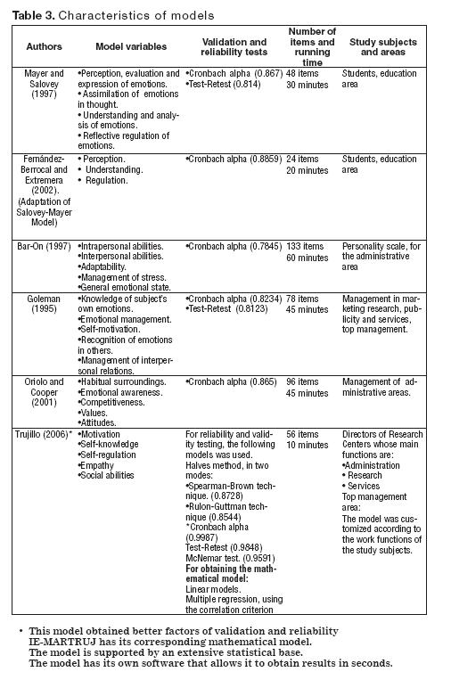 We found five EI models applicable to management, with two basic types: mixed and based on abilities. Among the mixed models, those of Cooper and Sawaf, and Goleman´s are especially noteworthy. Among models based on abilities, that of Salovey and Mayer is particularly worth mentioning.