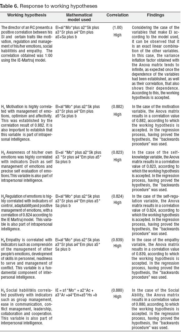 The validation model and reliability tests are described in detail, as well as the mathematical formulae used. As a general conclusion of this research, we show that: The model studied is an adequate instrument for the task proposed, and that the Emotional intelligence (EI) of directors of RCs is positively associated with: motivation, self-assessment, self-regulation, empathy and social skills.