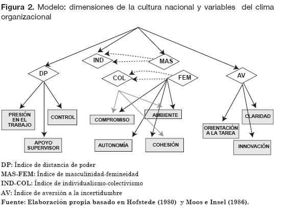 La relación teórica cultura nacional - clima organizacional puede observarse en la Figura 2. La distancia de poder se relaciona con la presión en el trabajo, el apoyo del supervisor y el control. El individualismo-colectivismo y la masculinidad-feminidad con el compromiso, la autonomía, la cohesión y el ambiente de trabajo y finalmente la aversión al riesgo tienen una estrecha relación con la orientación a la tarea, la claridad en las reglas y la innovación.