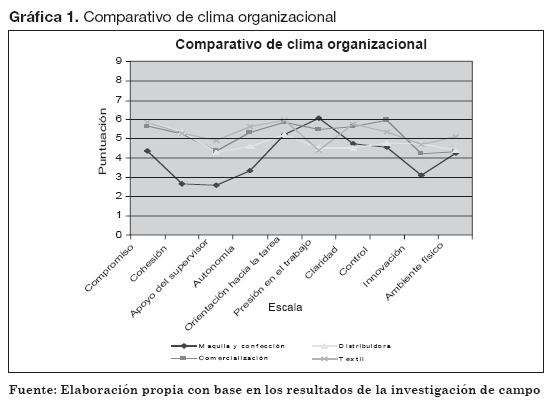 En la Gráfica 1 se presentan los resultados de las cuatro empresas objeto del estudio, con la finalidad de poder visualizar comparativamente el comportamiento organizacional de cada una de ellas y de ahí poder colegir el clima organizacional vigente en cada organización.