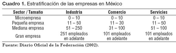 En todo el mundo existen empresas de diferente dimensión, las variables o criterios que se toman en cuenta para su clasificación difieren en cada país. En el caso de México, el ordenamiento de las empresas lo instituye la Secretaría de Economía, para ello establece como criterios de estratificación el número de empleados y la actividad económica, dando como resultado la clasificación que se presenta en el Cuadro 1. En ella se presentan cuatro tipos de organización: micro, pequeña, mediana y gran empresa. Es importante señalar que en el caso de la microempresa no puede considerarse el cero como un número válido, ya que se requiere por lo menos de un empleado -o dueño- en el negocio.