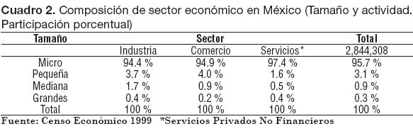 En el Cuadro 2 se muestra la composición de empresas en México, en términos de participación porcentual. Se puede observar que el mayor número de establecimientos económicos lo constituye la microempresa con el 95.7% del total, mientras que el objeto de estudio de este trabajo está en el estrato de las PYMES con un 4% del total. Los tres tipos de empresas antes señaladas constituyen el 99.7 % del total.