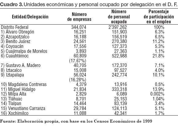 En el Cuadro 3, se puede observar que la delegación Iztapalapa contribuye con el 16% al total de unidades económicas ubicadas en el Distrito Federal y con el 10% de empleos.