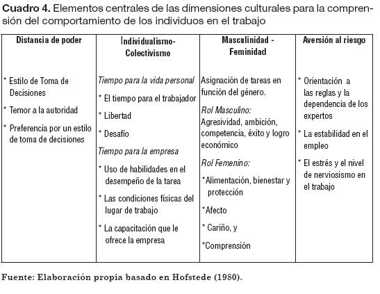 Las contribuciones teóricas de Hofstede6 en relación con las dimensiones de la cultura nacional y su influencia sobre la percepción del estilo de gestión sirven para interpretar y explicar la interacción, cultura y clima organizacional del estudio de caso que nos ocupa, asimismo, permite hacer inferencias respecto al estilo de dirección imperante en las organizaciones analizadas.