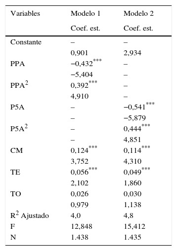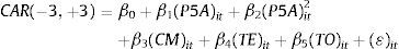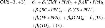 11 Para validar la robustez de los resultados se procedió a correr nuevamente los modelos 1 y 2, pero tomando como variable dependiente los CAR (–1, +1) y (–5, +5); los resultados corroboran los obtenidos inicialmente, encontrando los coeficientes de PPA y de P5A negativos y significativos, y los coeficientes de PPA2 y de P5A2 positivos y significativos. Estos resultados no son reportados en el presente trabajo por restricciones de espacio.